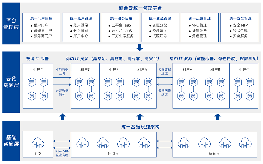 面向已部署多云、、信创基础设施的行业用户,,,,提供自助化、、、自动化的云服务快速交付服务。。管理企业内部多个数据中心的物理、、、虚拟资源,,以及容器、、私有云、、、公有云资源,,,并对以上资源进行混合编排,,,,提供基础软件和应用软件的自动化部署服务,,,以及云资源的全生命周期管理。。。